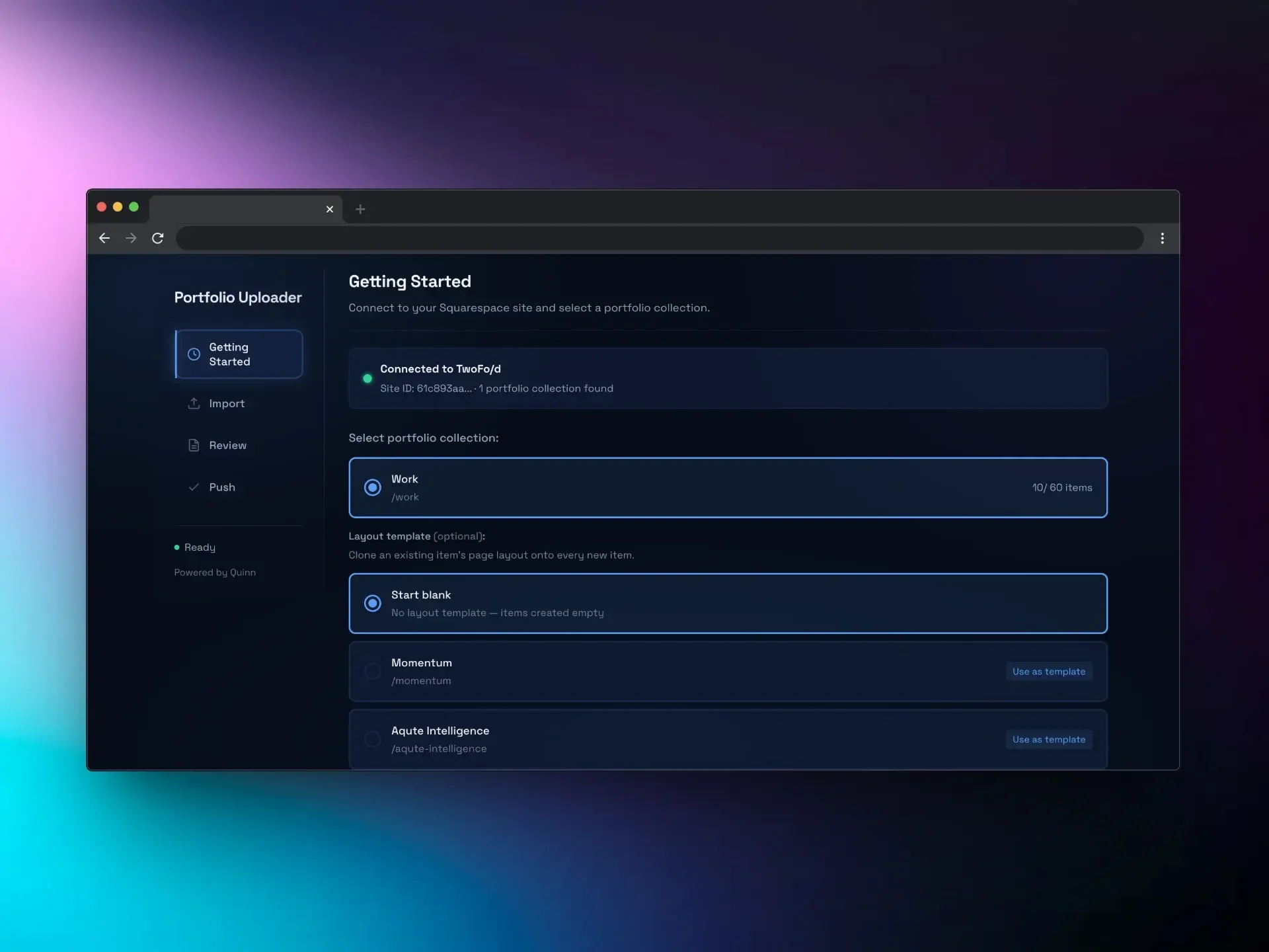 A lightweight tool that runs right inside your Squarespace admin. Upload a CSV, Excel file, or paste JSON, and push every item to your portfolio collection in one go.